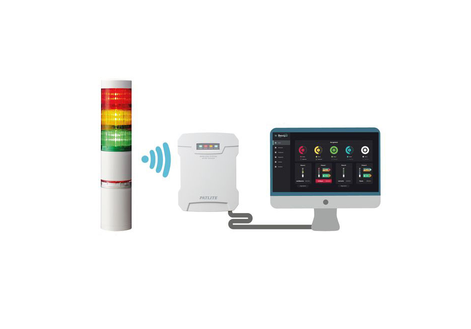- Côté Hardware : les colonnes lumineuses PATLITE installées sur vos machines, sans nécessiter de développement supplémentaires ni de modification sur vos automates, sont équipés d'une système émetteur/récepteur permettant de capter tous les états de vos machines grâce à des signaux lumineux et sonores.